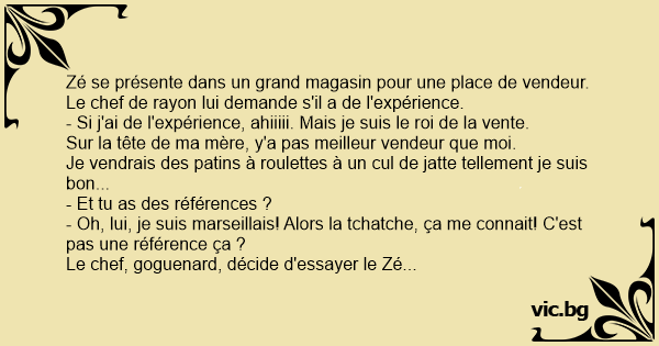 Zé se présente dans un grand magasin pour une place de vendeur. Le chef de rayon lui demande s'il a de l'expérience.