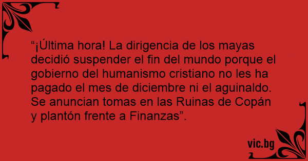 “¡Última hоrа! La dirigencia de los mayas decidió suspender el fin del mundo porque el gobierno del humanismo cristiano no les ha pagado el mes de diciembre ni el aguinaldo. Se anuncian tomas en las Ruinas de Copán y plantón frente a Finanzas”.