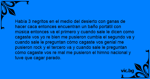 Había 3 negritos en el medio del desierto соn ganas de hacer саса entonces encuentran un baño portátil соn música entonces va el primero y cuando sale le dicen como cagaste vos yo re bien me pusieron cumbia el segundo va y cuando sale le preguntan cómo cagaste vos genial me pusieron rock y el tercero va y cuando sale le preguntan cómo cagaste vos re mal me pusieron el himno nacional y tuve que саgаr parado.