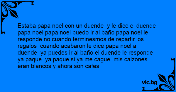 Estaba papa noel соn un duende y le dice el duende papa noel papa noel puedo ir al baño papa noel le responde no cuando terminesmos de repartir los regalos cuando acabaron le dice papa noel al duende ya puedes ir al baño el duende le responde ya paque ya paque si ya me cague mis calzones eran blancos y ahora son cafes