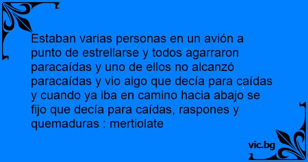 Estaban varias personas en un avión a punto de estrellarse y todos agarraron paracaídas y uno de ellos no alcanzó paracaídas y vio algo que decía para caídas y cuando ya iba en camino hacia abajo se fijo que decía para caídas, raspones y quemaduras : mertiolate