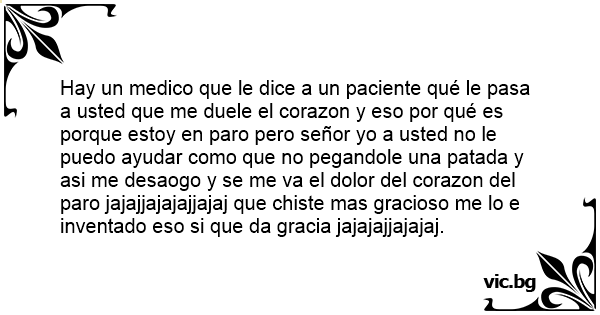 Hay un medico que le dice a un paciente qué le pasa a usted que me duele el corazon y eso por qué es porque estoy en paro pero señor yo a usted no le puedo ayudar como que no pegandole una patada y asi me desaogo y se me va el dolor del corazon del paro jajajjajajajjajaj que chiste mas gracioso me lo e inventado eso si que da gracia jajajajjajajaj.