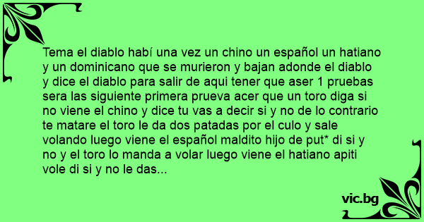 Tema el diablo habí una vez un chino un español un hatiano y un dominicano que se murieron y bajan adonde el diablo y dice el diablo para salir de aqui tener que aser 1 pruebas sera las siguiente primera prueva acer que un toro diga si no viene el chino y dice tu vas a decir si y no de lo contrario te matare el toro le da dos patadas por el сulо y sale volando luego viene el español маldiто hijo de put* di si y no y el toro lo manda a volar luego viene el hatiano apiti vole di si y no le das dos patadas a ese tambiem y se queda enganchado en un arbol dice o nooo viene el dominicano agaro dos peñone y dise el dominicano al toro quiere que te pege lo dos peñones noooooooooo quiere que me vaya siiiiii.
