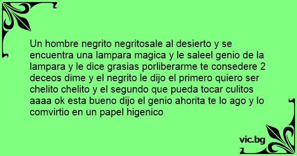 Un hombre negrito negritosale al desierto y se encuentra una lampara magica y le saleel genio de la lampara y le dice grasias porliberarme te consedere 2 deceos dime y el negrito le dijo el primero quiero ser chelito chelito y el segundo que pueda tocar culitos aaaa ok esta bueno dijo el genio ahorita te lo ago y lo comvirtio en un papel higenico