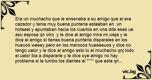 Era un muchacho que le ensenaba a su amigo que el era cazador y tenia muy buena punteria estaaban en un hoteeel y apuntaban hacia los cuartos en una dde esas ue asu esposa qn otro y le dice al amigo mira mi uieja y le dice el amigo si tienes buena punteria disparales en los hueuos weeey pero en los merooos hueeeeuos y dice no tengo ualor y le dice al amigo aslo tu el muchacho qnj todo el ualor iba a dispararle y le dice oye amigo no hay problema si le tumbo los dientes al **** que esta qn tu uuieja