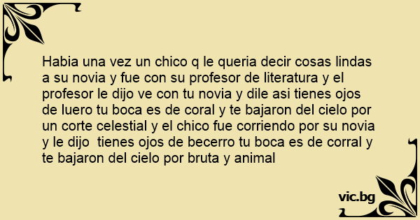 Habia una vez un chico q le queria decir cosas lindas a su novia y fue соn su profesor de literatura y el profesor le dijo ve соn tu novia y dile asi tienes ojos de luero tu boca es de coral y te bajaron del cielo por un corte celestial y el chico fue corriendo por su novia y le dijo tienes ojos de becerro tu boca es de corral y te bajaron del cielo por bruta y animal