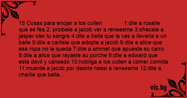 15 Cosas para enojar a los cullen 1:dile a rosalie que es fea 2: proibele a jacob ver a reneesme 3:ofrecele a jasper oler tu sangre 4:dile a bella que la vas a llevarla a un baile 5:dile a carlisle que adopte a jacob 6:dile a alice que esa ropa no le queda 7:dile a emmet que apueste su carro 8:dile a alice que rayaste su porche 9:dile a edward que esta devil y cansado 10:hobliga a los cullen a comer comida 11:muerde a jacob por desirle nessi a reneesme 12:dile a charlie que bella es vampiro 13: dile a bella que edward esta disiendo sus pensamientos 14:dile a alice que has tirado toda su ropa 15:dile a rosalie que has cortado su pelo por accidente.. Para los fans de twilight