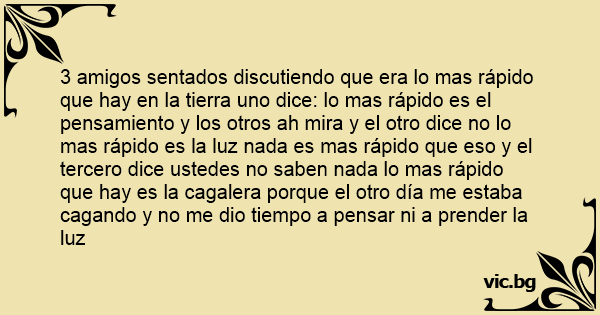 3 amigos sentados discutiendo que era lo mas rápido que hay en la tierra uno dice: lo mas rápido es el pensamiento y los otros ah mira y el otro dice no lo mas rápido es la luz nada es mas rápido que eso y el tercero dice ustedes no saben nada lo mas rápido que hay es la cagalera porque el otro día me estaba cagando y no me dio tiempo a pensar ni a prender la luz