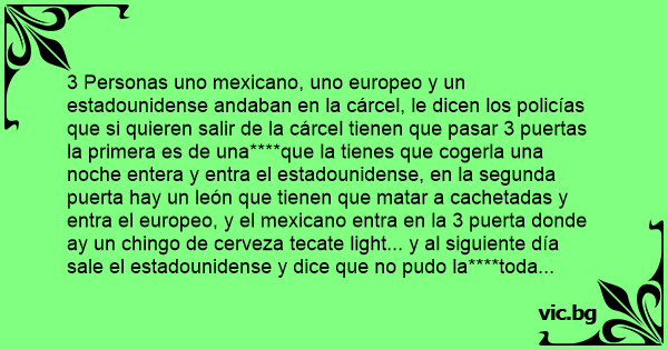 3 Personas uno mexicano, uno europeo y un estadounidense andaban en la cárcel, le dicen los policías que si quieren salir de la cárcel tienen que pasar 3 puertas la primera es de una****que la tienes que cogerla una noche entera y entra el estadounidense, en la segunda puerta hay un león que tienen que matar a cachetadas y entra el europeo, y el mexicano entra en la 3 puerta donde ay un chingo de cerveza tecate light... y al siguiente día sale el estadounidense y dice que no pudo la****toda la noche, después sale el león pero no el europeo que se lo había comido, después sale el mexicano bien borracho y dicen los policías que fue el único que pasó pero tiene que hacer las dos sobrantes y entra al del león y al día siguiente sale y dice dónde está la****que debo matar a cachetadas...!!!! xD salió al revés