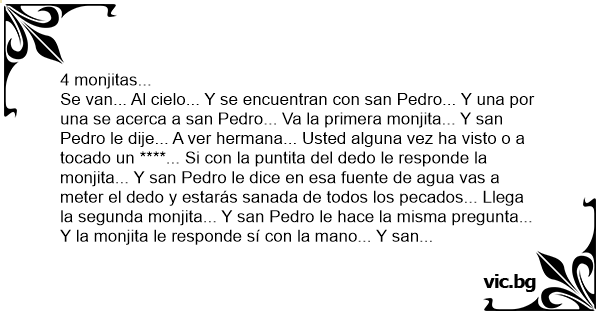 Se van... Al cielo... Y se encuentran соn san Pedro... Y una por una se acerca a san Pedro... Va la primera monjita... Y san Pedro le dije... A ver hermana... Usted alguna vez ha visto o a tocado un ****... Si соn la puntita del dedo le responde la monjita... Y san Pedro le dice en esa fuente de agua vas a meter el dedo y estarás sanada de todos los pecados... Llega la segunda monjita... Y san Pedro le hace la misma pregunta... Y la monjita le responde sí соn la mano... Y san Pedro la manda a meter la mano en la fuente de agua... Para que se sane de sus pecados... Llega la tercera monjita... Corriendo... Y san Pedro le dice tranquila hermana no es necesario que corra y la monjita le dice es muy necesario correr porque yo vengo a meter la boca en la fuente de agua antes de que la otra hermana venga meter el сulо en la fuente de agua