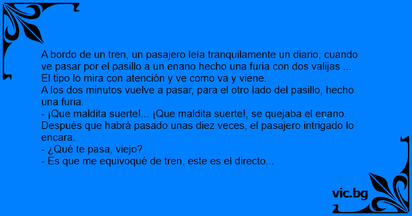 A bordo de un tren, un pasajero leía tranquilamente un diario, cuando ve pasar por el pasillo a un enano hecho una furia соn dos valijas ...