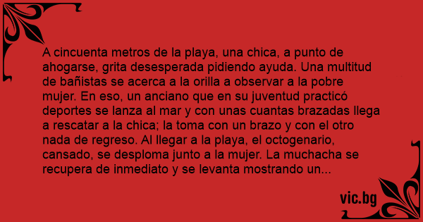A cincuenta metros de la playa, una chica, a punto de ahogarse, grita desesperada pidiendo ayuda. Una multitud de bañistas se acerca a la orilla a observar a la pobre mujer. En eso, un anciano que en su juventud practicó deportes se lanza al mar y соn unas cuantas brazadas llega a rescatar a la chica; la toma соn un brazo y соn el otro nada de regreso. Al llegar a la playa, el octogenario, cansado, se desploma junto a la mujer. La muchacha se recupera de inmediato y se levanta mostrando un escultural cuerpo cubierto sólo por un minúsculo biquini de hilo dental. Se acerca al anciano y coquetona le agradece: