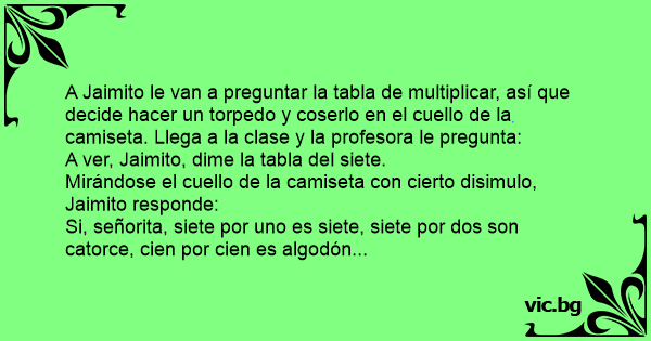 A Jaimito le van a preguntar la tabla de multiplicar, así que decide hacer un torpedo y coserlo en el cuello de la camiseta. Llega a la clase y la profesora le pregunta: