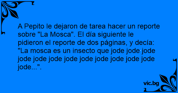 A Pepito le dejaron de tarea hacer un reporte sobre "La Mosca". El día siguiente le pidieron el reporte de dos páginas, y decía: