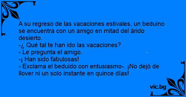 A su regreso de las vacaciones estivales, un beduino se encuentra соn un amigo en mitad del árido desierto.