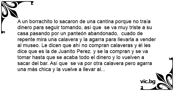 A un borrachito lo sacaron de una cantina porque no traía dinero para seguir tomando, así que se va muy triste a su casa pasando por un panteón abandonado, cuado de repente mira una calavera y la agarra para llevarla a vender al museo. Le dicen que ahí no compran calaveras y él les dice que es la de Juanito Perez. y se la compran y se va tomar hasta que se acaba todo el dinero y lo vuelven a sacar del bar. Así que se va por otra calavera pero agarra una más chica y la vuelve a llevar al museo y le vuelven a decir que no compran calaveras. Y él les dice que es la de Juanito Perez, pero le dicen que ya le compraron la de Juanito Perez, pero él les responde: Es que esta es de cuando él estaba chico.