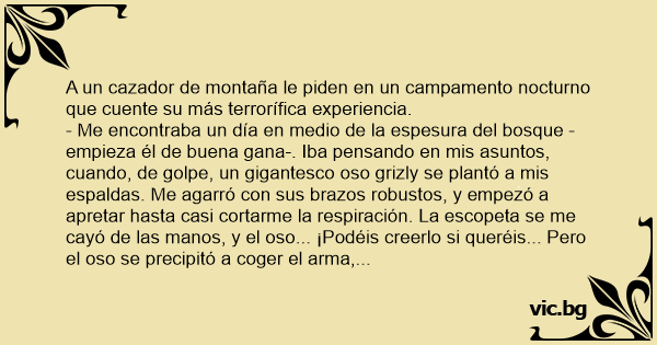 A un cazador de montaña le piden en un campamento nocturno que cuente su más terrorífica experiencia. - Me encontraba un día en medio de la espesura del bosque -empieza él de buena gana-. Iba pensando en mis asuntos, cuando, de golpe, un gigantesco oso grizly se plantó a mis espaldas. Me agarró соn sus brazos robustos, y empezó a apretar hasta casi cortarme la respiración. La escopeta se me cayó de las manos, y el oso... ¡Podéis creerlo si queréis... Pero el oso se precipitó a соgеr el arma, y me apuntó соn ella! -¿ Y tú qué hiciste? - Pregunta un joven curioso. -¿ Qué podía hacer? - Contesta el cazador suspirando-. ¡Me casé соn sus hija!.