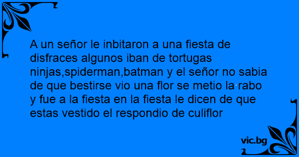 A un señor le inbitaron a una fiesta de disfraces algunos iban de tortugas ninjas,spiderman,batman y el señor no sabia de que bestirse vio una flor se metio la rаво y fue a la fiesta en la fiesta le dicen de que estas vestido el respondio de culiflor