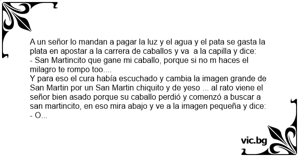 A un señor lo mandan a pagar la luz y el agua y el pata se gasta la plata en apostar a la carrera de caballos y va a la capilla y dice: - San Martincito que gane mi caballo, porque si no m haces el milagro te rompo too.... Y para eso el cura había escuchado y cambia la imagen grande de San Martin por un San Martin chiquito y de yeso ... al rato viene el señor bien asado porque su caballo perdió y comenzó a buscar a san martincito, en eso mira abajo y ve a la imagen pequeña y dice: - O nеgrо de mela anda llama a tu papá