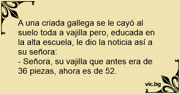 A una criada gallega se le cayó al suelo toda a vajilla pero, educada en la alta escuela, le dio la noticia así a su señora: