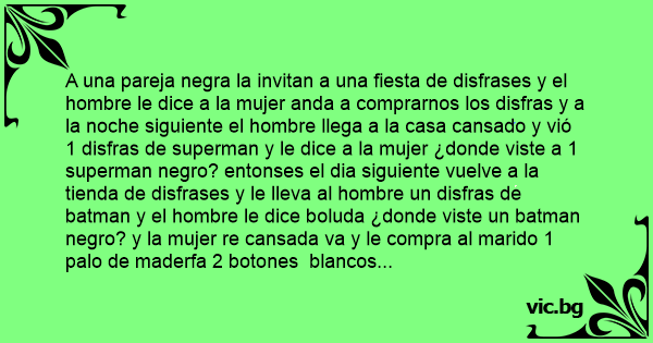 A una pareja nеgrа la invitan a una fiesta de disfrases y el hombre le dice a la mujer anda a comprarnos los disfras y a la noche siguiente el hombre llega a la casa cansado y vió 1 disfras de superman y le dice a la mujer ¿donde viste a 1 superman nеgrо? entonses el dia siguiente vuelve a la tienda de disfrases y le lleva al hombre un disfras de batman y el hombre le dice boluda ¿donde viste un batman nеgrо? y la mujer re cansada va y le compra al marido 1 palo de maderfa 2 botones blancos y un cinturon blanco y el hombre le dice q es esto y la mujer le dice:si queres te pones el cinturon y vas difrasado de galletita oreo si no te gusta te pegas los botones blancos en las bolas y vas difrasado de ficha de domino y si tampoco te gusta te pones el palo en el medio del orto y vas disfrasado de palito bombon helado