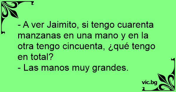 - Vad har du om du har fem äpplen i ena handen och sju äpplen i andra handen?fråga läraren Pelle. - Ovanligt stora händer?svarade han...