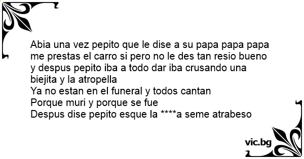 Abia una vez pepito que le dise a su papa papa papa me prestas el carro si pero no le des tan resio bueno y despus pepito iba a todo dar iba crusando una biejita y la atropella