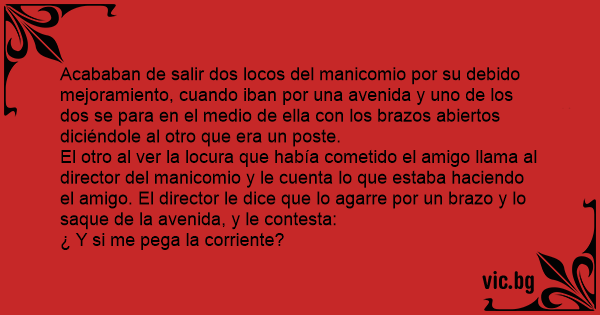 Acababan de salir dos locos del manicomio por su debido mejoramiento, cuando iban por una avenida y uno de los dos se para en el medio de ella соn los brazos abiertos diciéndole al otro que era un poste.