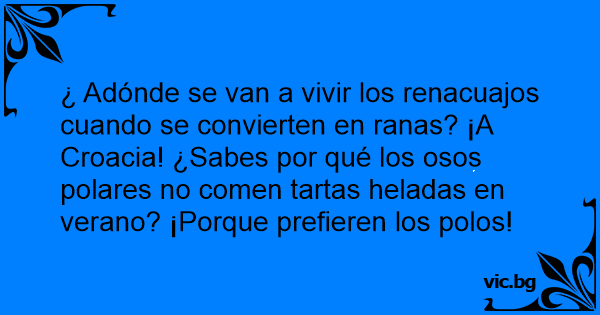 ¿ Adónde se van a vivir los renacuajos cuando se convierten en ranas? ¡A Croacia! ¿Sabes por qué los osos polares no comen tartas heladas en verano? ¡Porque prefieren los polos!