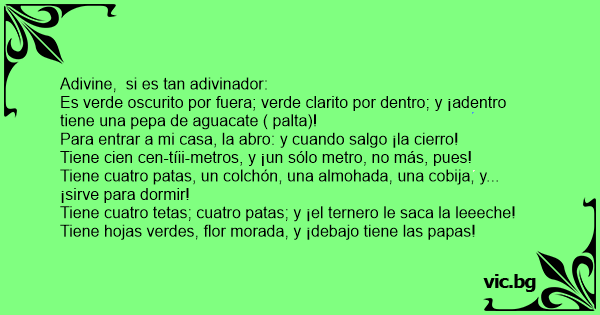 Es verde oscurito por fuera; verde clarito por dentro; y ¡adentro tiene una pepa de aguacate ( palta)!