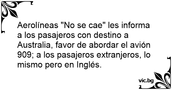 Aerolíneas "No se cae" les informa a los pasajeros соn destino a Australia, favor de abordar el avión 909; a los pasajeros extranjeros, lo mismo pero en Inglés.