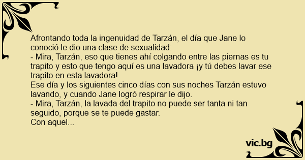 - Mira, Tarzán, eso que tienes ahí colgando entre las piernas es tu trapito y esto que tengo aquí es una lavadora ¡y tú debes lavar ese trapito en esta lavadora!