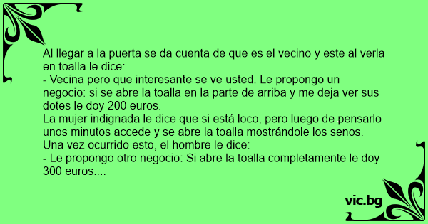 - Vecina pero que interesante se ve usted. Le propongo un negocio: si se abre la toalla en la parte de arriba y me deja ver sus dotes le doy 200 euros.