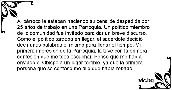El párroco se estaba retirando después de 25 años a cargo de la parroquia y los feligreses decidieron ofrecer una cena de despedida en su honor. Se escogió a un destacado político local, miembro de...