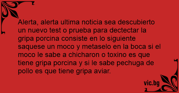 Alerta, alerta ultima noticia sea descubierto un nuevo test o prueba para dectectar la gripa porcina consiste en lo siguiente saquese un moco y metaselo en la boca si el moco le sabe a chicharon o toxino es que tiene gripa porcina y si le sabe pechuga de pollo es que tiene gripa aviar.
