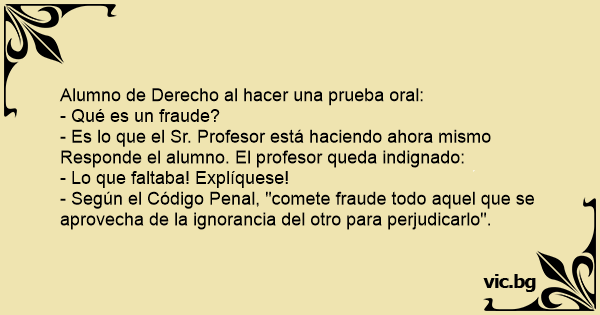 Aluno de Direito ao fazer prova oral: - O que é uma fraude? - É o que o senhor professor está fazendo - responde o aluno. O professor fica indignado: - Ora essa, explique-se. Então diz o aluno: -...