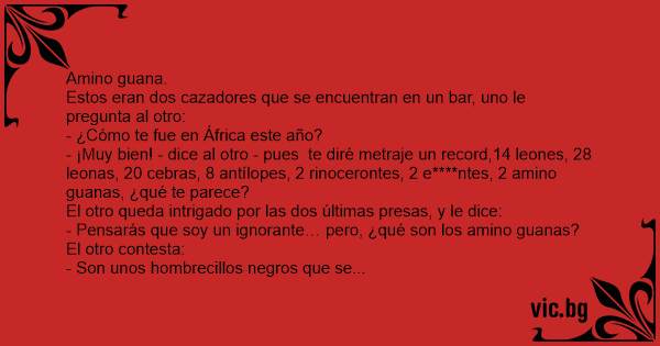 - ¡Muy bien! - dice al otro - pues te diré metraje un record,14 leones, 28 leonas, 20 cebras, 8 antílopes, 2 rinocerontes, 2 e****ntes, 2 amino guanas, ¿qué te parece?