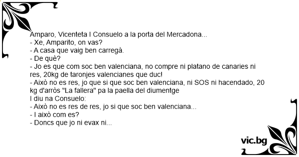 Amparo, Vicenteta I Consuelo a la porta del Mercadona... - Xe, Amparito, on vas? - A casa que vaig ben carregà. - De què? - Jo es que com soc ben valenciana, no compre ni platano de canaries ni res, 20kg de taronjes valencianes que duc! - Això no es res, jo que si que soc ben valenciana, ni SOS ni hacendado, 20 kg d'arròs "La fallera" pa la paella del diumentge I diu na Consuelo: - Això no es res de res, jo si que soc ben valenciana... - I això com es? - Doncs que jo ni evax ni tampax, en ma casa fartons polo de tota la vida!