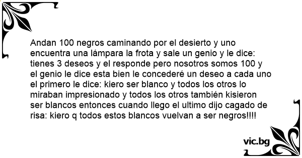 Andan 100 negros caminando por el desierto y uno encuentra una lámpara la frota y sale un genio y le dice: tienes 3 deseos y el responde pero nosotros somos 100 y el genio le dice esta bien le concederé un deseo a cada uno el primero le dice: kiero ser blanco y todos los otros lo miraban impresionado y todos los otros también kisieron ser blancos entonces cuando llego el ultimo dijo cagado de risa: kiero q todos estos blancos vuelvan a ser negros!!!!