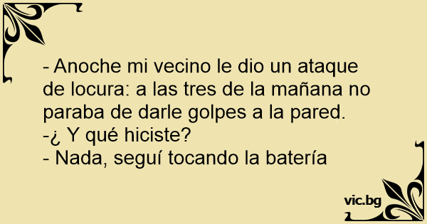 - Mi vecino me tiene cansado, todos los días me toca el timbre a las 4 AM y me insulta. - ¿Y tu qué haces? - Nada, sigo tocando la batería...