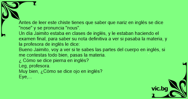 Antes de leer este chiste tienes que saber que nariz en inglés se dice "nose" y se pronuncia "nous". Un día Jaimito estaba en clases de inglés, y le estaban haciendo el examen final, para saber su nota definitiva a ver si pasaba la materia, y la profesora de inglés le dice: Bueno Jaimito, voy a ver si te sabes las partes del cuerpo en inglés, si me contestas todo bien, pasas la materia. ¿ Cómo se dice pierna en inglés? Leg, profesora. Muy bien, ¿Cómo se dice ojo en inglés? Eye, profesora. Muy bien, ¿Cómo se dice cabello en inglés? Hair, profesora. Muy bien, ¿Cómo se dice cabeza en inglés? Head, profesora. ¡ Muy bien!, y por último, ¿Cómo se dice nariz en inglés? Nose, profesora. ¡ Ay, tienes un cero!