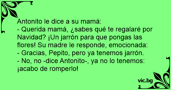 - Querida mamá, ¿sabes qué te regalaré por Navidad? ¡Un jarrón para que pongas las flores! Su madre le responde, emocionada: