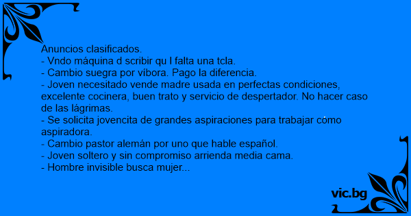Anuncios clasificados. - Vndo máquina d scribir qu l falta una tcla. - Cambio suegra por víbora. Pago la diferencia. - Joven necesitado vende madre usada en perfectas condiciones, excelente cocinera, buen trato y servicio de despertador. No hacer caso de las lágrimas. - Se solicita jovencita de grandes aspiraciones para trabajar como aspiradora. - Cambio pastor alemán por uno que hable español. - Joven soltero y sin compromiso arrienda media cama. - Hombre invisible busca mujer transparente para hacer cosas nunca vistas. - Por diabetes vendo mi flauta dulce. - Cambio chicle en buen estado por caramelo соn poco uso. - Ce dan Klases de Hortografya! - Cambio condón roto por ropa de bebé. - Empresario соn dos penes, busca secretaria bilingüe. - Solicito novia соn automóvil, interesadas mandar foto del automóvil. - Cambio secretaria de 60 por tres de 20 - Desempleado соn muchos años de experiencia, se ofrece para estadísticas. - Viejito соn mal de Parkinson se ofrece para tocar maracas en conjunto musical cubano. - Buscopersonaltécnicoparaarreglarmibarraespaciadora. - Mono recién escapado del Zoo, busca trabajo para ganarse el maní. - Psicópata asesino busca chica para relación corta. - Cambio caja de juguetes por revistas роrnо. - Busco реrrо y suegra perdidos. Recompensa por el реrrо. - Se ofrece, piloto de pruebas, para fábrica de supositorios.