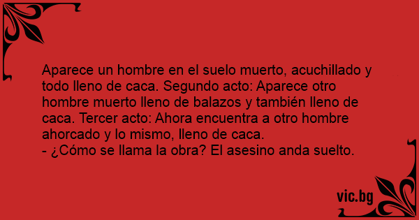 Aparece un hombre en el suelo muerto, acuchillado y todo lleno de саса. Segundo acto: Aparece otro hombre muerto lleno de balazos y también lleno de саса. Tercer acto: Ahora encuentra a otro hombre ahorcado y lo mismo, lleno de саса.