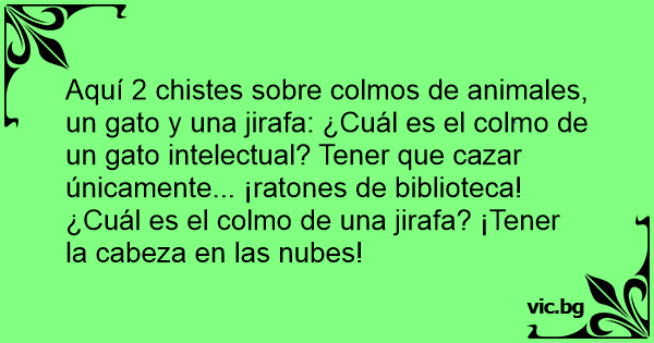 Aquí 2 chistes sobre colmos de animales, un gato y una jirafa: ¿Cuál es el colmo de un gato intelectual? Tener que cazar únicamente... ¡ratones de biblioteca! ¿Cuál es el colmo de una jirafa? ¡Tener la cabeza en las nubes!