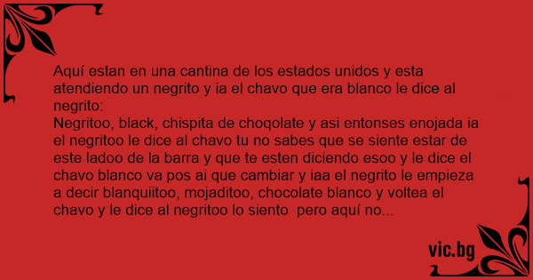 Negritoo, black, chispita de choqolate y asi entonses enojada ia el negritoo le dice al chavo tu no sabes que se siente estar de este ladoo de la barra y que te esten diciendo esoo y le dice el chavo blanco va pos ai que cambiar y iaa el negrito le empieza a decir blanquiitoo, mojaditoo, chocolate blanco y voltea el chavo y le dice al negritoo lo siento pero aquí no atendemos negros.