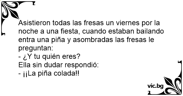 Asistieron todas las fresas un viernes por la noche a una fiesta, cuando estaban bailando entra una piña y asombradas las fresas le preguntan: