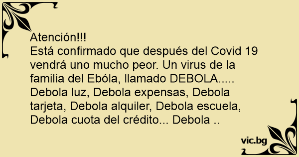 Está confirmado que después del Covid 19 vendrá uno mucho peor. Un virus de la familia del Ebóla, llamado DEBOLA..... Debola luz, Debola expensas, Debola tarjeta, Debola alquiler, Debola escuela, Debola cuota del crédito... Debola ..