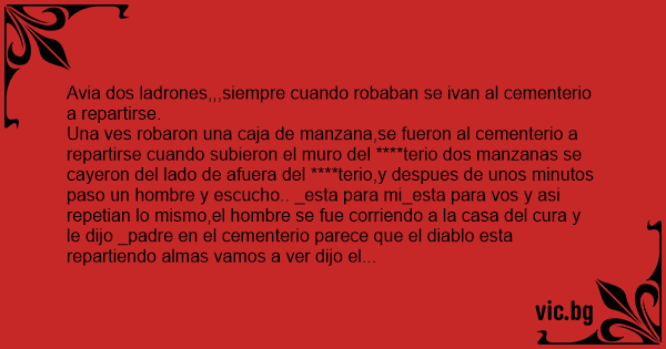 Una ves robaron una caja de manzana,se fueron al cementerio a repartirse cuando subieron el muro del ****terio dos manzanas se cayeron del lado de afuera del ****terio,y despues de unos minutos paso un hombre y escucho.. _esta para mi_esta para vos y asi repetian lo mismo,el hombre se fue corriendo a la casa del cura y le dijo _padre en el cementerio parece que el diablo esta repartiendo almas vamos a ver dijo el hombre ,,asustado,,,el cura dijo no yo no puedo ir por que tengo el pie roto... Mintio el cura,,,el hombre le contesto,,yo te llevo alsado,,,,se fuero al cementerio,,y seguian los ladrones,,,esta para vos esta parami,,,y los que estan afuera una para mi y una para vos,,,y el cura salto del regaso del hombre y se fue corriendo a su casa teniendo el pie roto ,,..