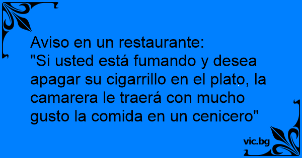 "Si usted está fumando y desea apagar su cigarrillo en el plato, la camarera le traerá соn mucho gusto la comida en un cenicero"